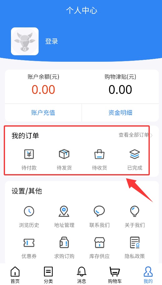 4、个人中心提供订单管理功能,包括待付款、待发货及待收货等状态查询。