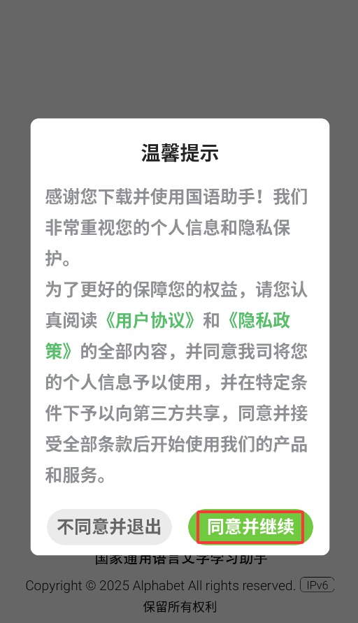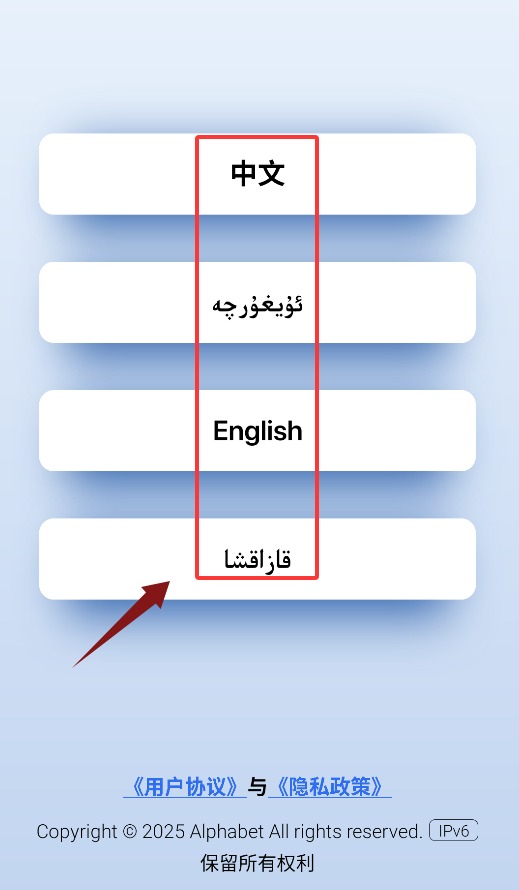 1、首次启动应用时需点击同意用户协议,之后进入语言选择界面。