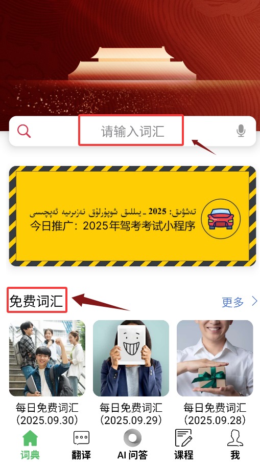 3、词典功能支持手动输入词汇查询释义,并提供常用免费词库学习模块。