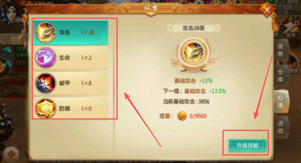 2、调整仙盟心法加点方案,侧重攻击和防御属性来获得百分比能力提升。