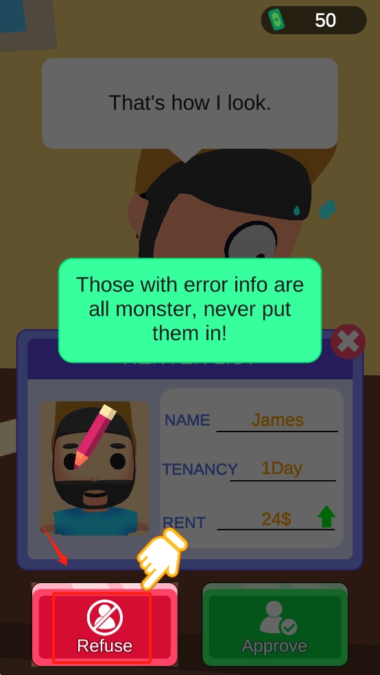 2、点击拒绝按钮,拒绝有错误信息的租客入住。