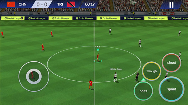 屏幕左下角的摇杆可以控制球员走位,右下角则有三个按钮,分别是传球、射门、切换控制球员等,当然在防守的时候三个按键就自动变为了强求、铲球等动作。