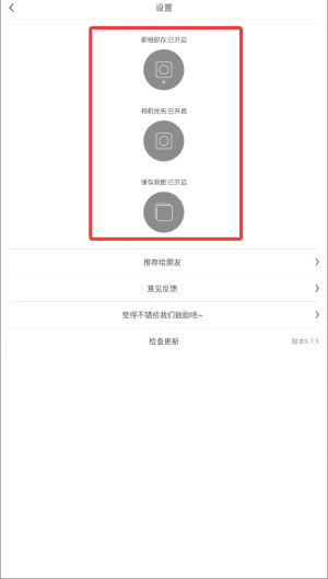 3、在拍摄设置中勾选"相机优先启动"和"保留原图"两个核心功能选项。