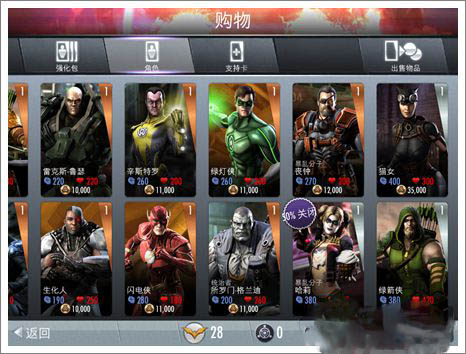 游戏的人物还是很丰富的,基本大家耳熟能详的英雄及反派都包含在内。小丑,莱克斯卢瑟,黑亚当这三个强悍Boss都在游戏中,除了卢瑟没有金卡形象,小丑和黑亚当都有金卡形象。当然,最牛叉的还是要属超人、蝙蝠侠和神奇女侠,每个人的技能都是秒杀级。