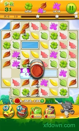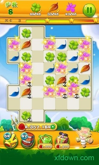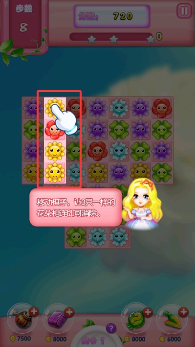 3、通过交换相邻花朵的位置,使三朵及以上同色花卉连成直线即可完成消除。