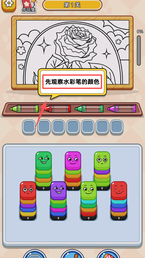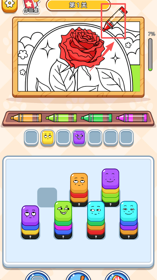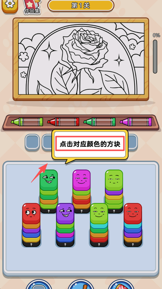 1、通过点击选中颜色并填充至对应方块,正确涂色后方块即被消除,简单直观的操作方式,易于上手。