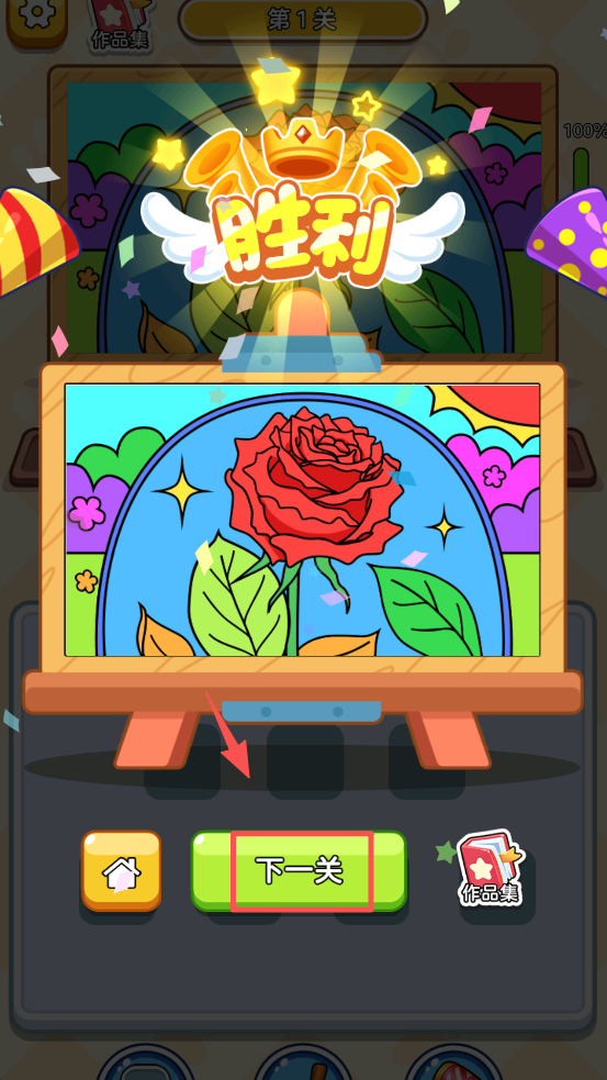 4、涂色完成后,点击“下一关”按钮,进入下一关卡,继续你的绘画挑战。