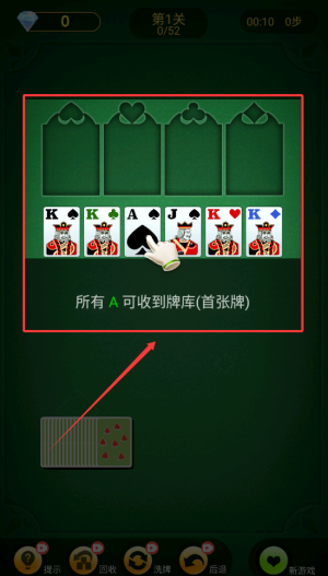 2、游戏核心玩法要求通过最少移动次数完成挑战,将十六组纸牌分批次向右移动,每次推动三张牌,需要严格按照花色从A到K的顺序完整排列。