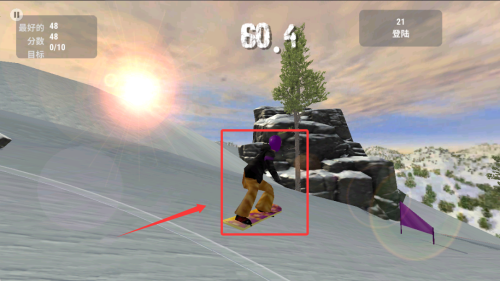 3、通过倾斜设备与触控操作控制滑雪板移动方向,在雪道上完成高速滑行与特技动作。