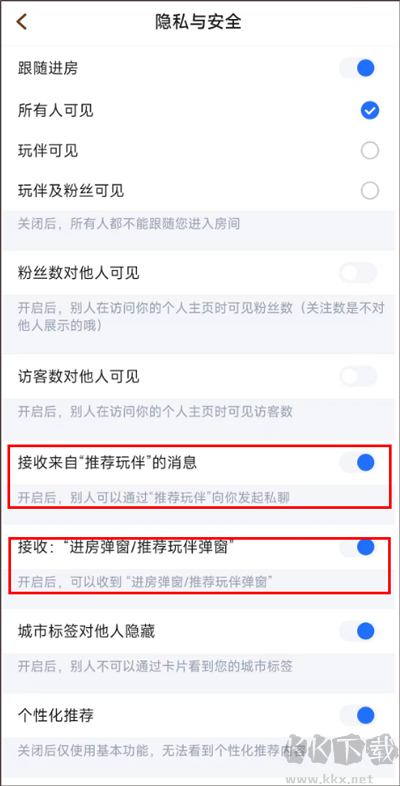 4、在【隐私与安全】的页面中,关闭【接收来自 “推荐玩伴” 的消息】,【接收:" 进房弹窗 / 推荐玩伴弹窗】选项即可。