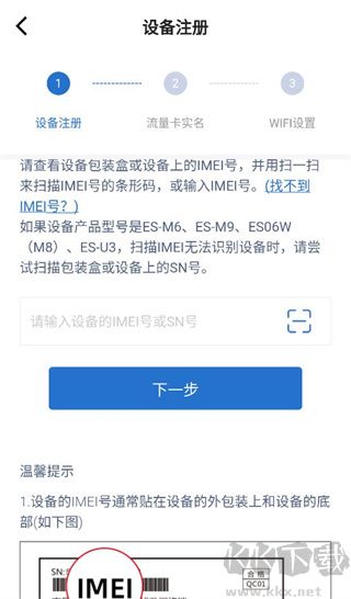 进入“设备注册”,在输入框中输入设备IMEI号/SN号,也可以通过扫一扫扫描设备上的IMEI号;