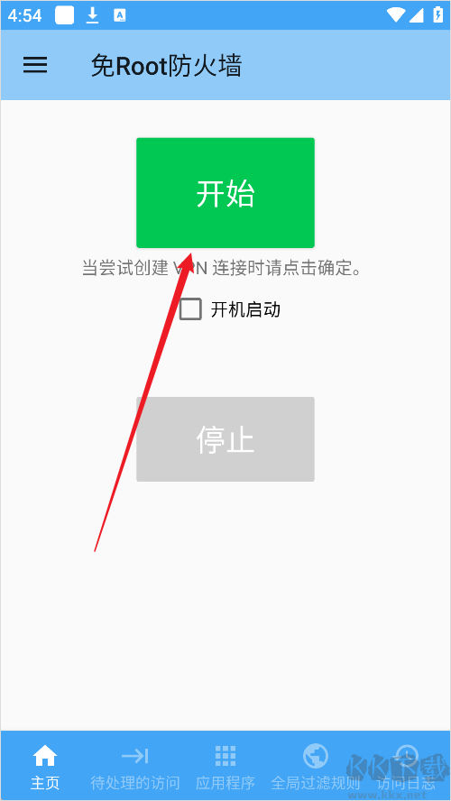 1、打开免root防火墙App后,先点击主界面的“开始”按钮进入设置;