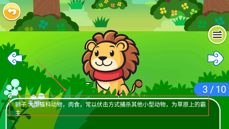2、在每个生动逼真的场景里自由点击各种动物形象,能够听到它们独特的叫声并观看详细的习性介绍动画,比如了解狮子如何捕猎。