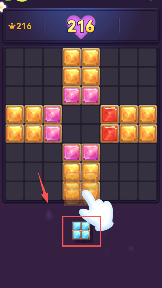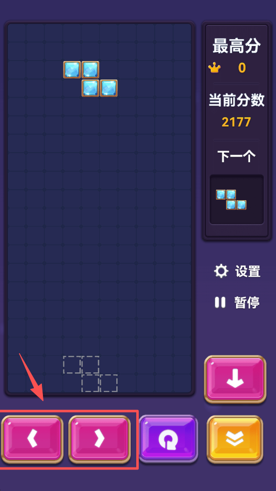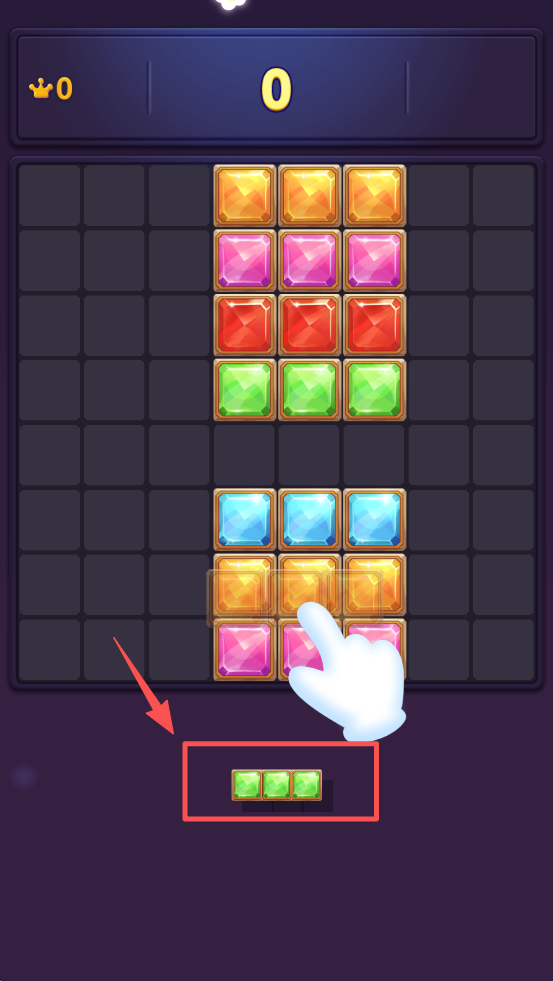 1、控制下落宝石:通过触屏操作移动、旋转七彩宝石,将其放置在棋盘格中,尽可能填满整行或整列。