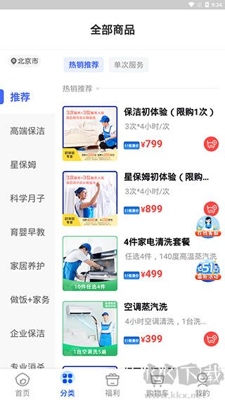 2、切换到【分类】页面之后,我们还能看到所有的服务商品分类,如高端保洁、星保姆、科学月子等。
