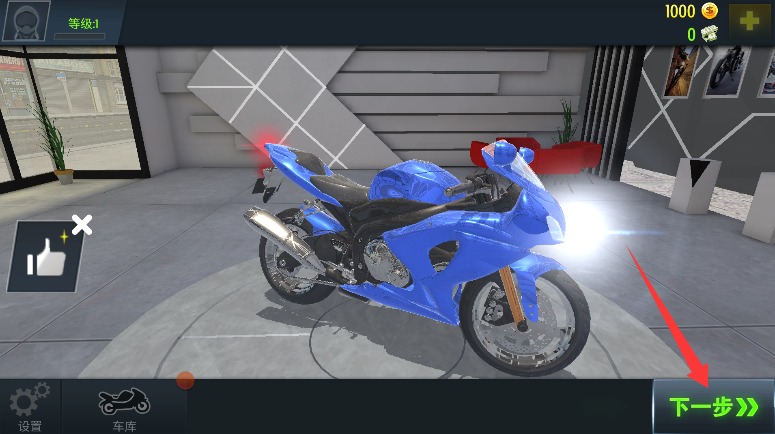 1、进入游戏后首先挑选心仪的摩托车款,确认选择后点击下一步继续操作。