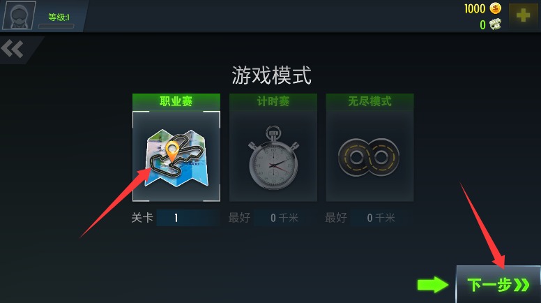 2、在多种赛事模式中选定职业赛道的首关挑战,点击下一步开启竞速闯关之旅。