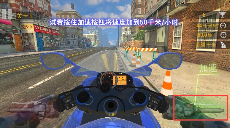 4、持续按住屏幕界面右下角的加速按键,将车速稳步提升至50千米每小时以上数值。