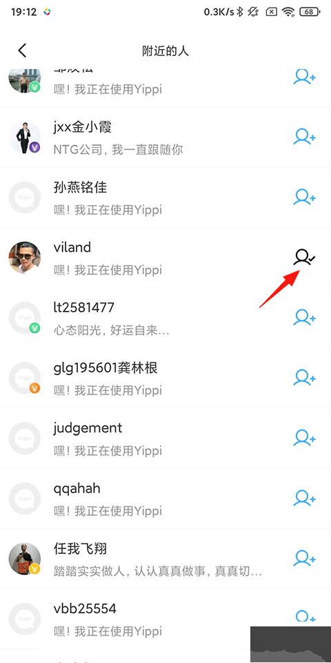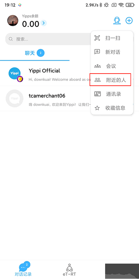 1、打开Yippi聊天软件,点击右上角的+按钮,在弹出的列表中选择附近的人;
