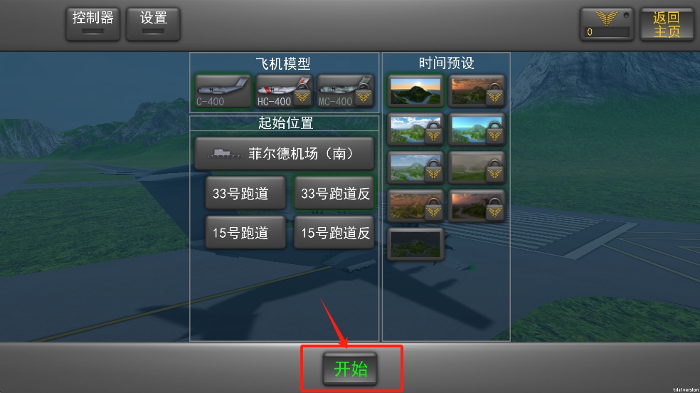 3、点击“开始”按钮,选择飞机型号和起始位置,准备起飞。