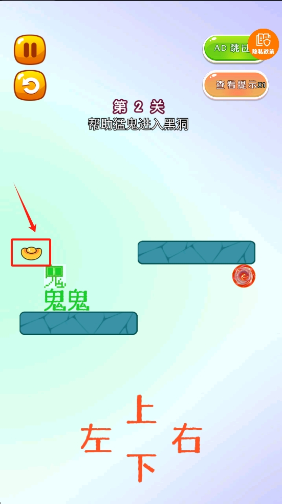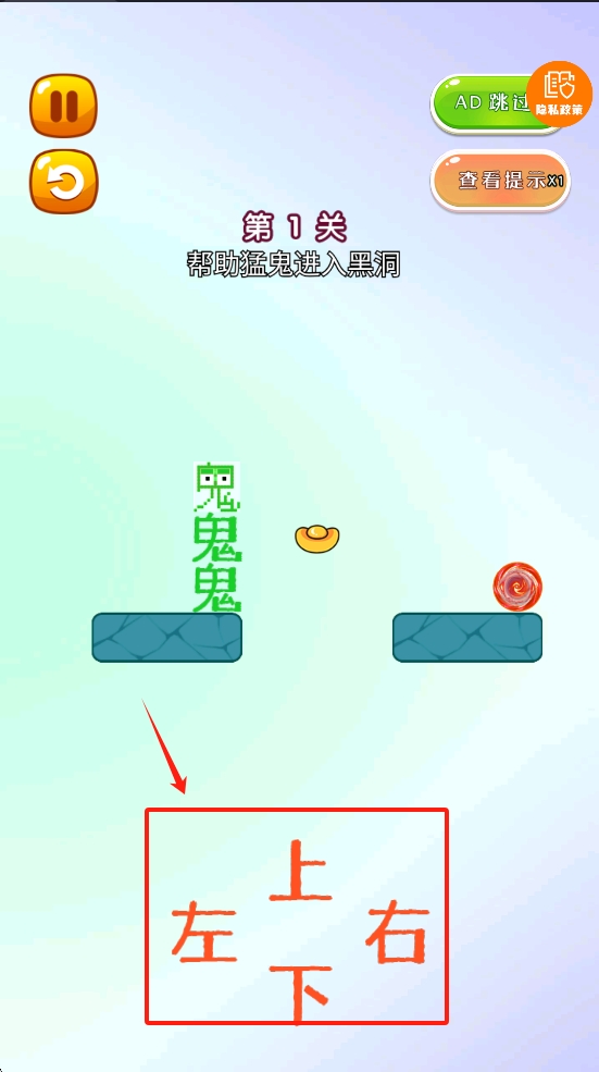 2、然点击“第1关”并根据提示,帮助猛鬼进入黑洞,开始你的冒险。