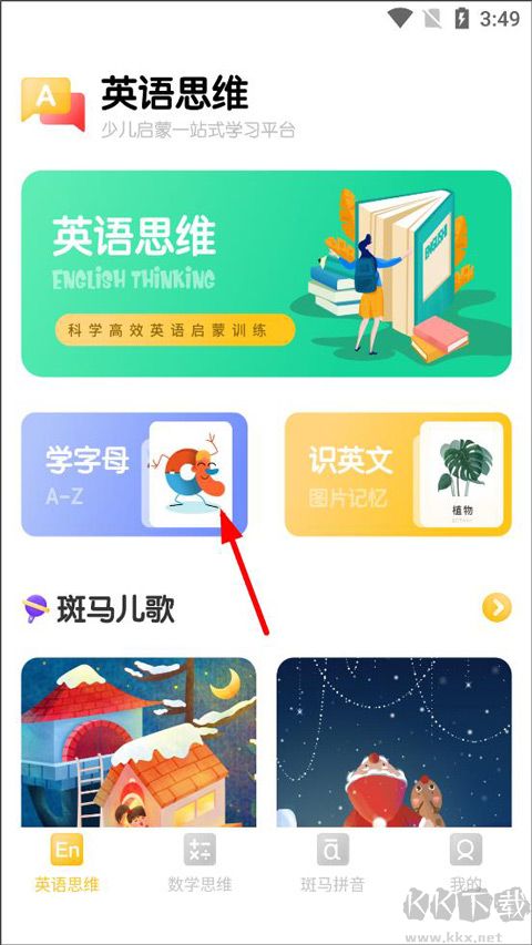 1、点开嘟嘟数学 app,登录后进入英语思维主页,可在此页面认识字母、熟悉英文、学唱儿歌等,点击认识字母。