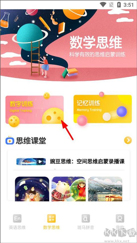 3、点开数学思维页面,可开展数字练习、记忆练习以及思维课程,点击数字练习。