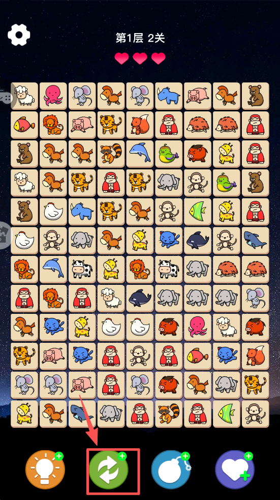 2、在游戏关卡界面,点击任意两个相同的宠物图案进行消除。