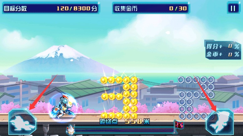 3、左侧按键控制角色进行下蹲滑行动作,右侧按键操控角色跳跃且支持双击连跳。