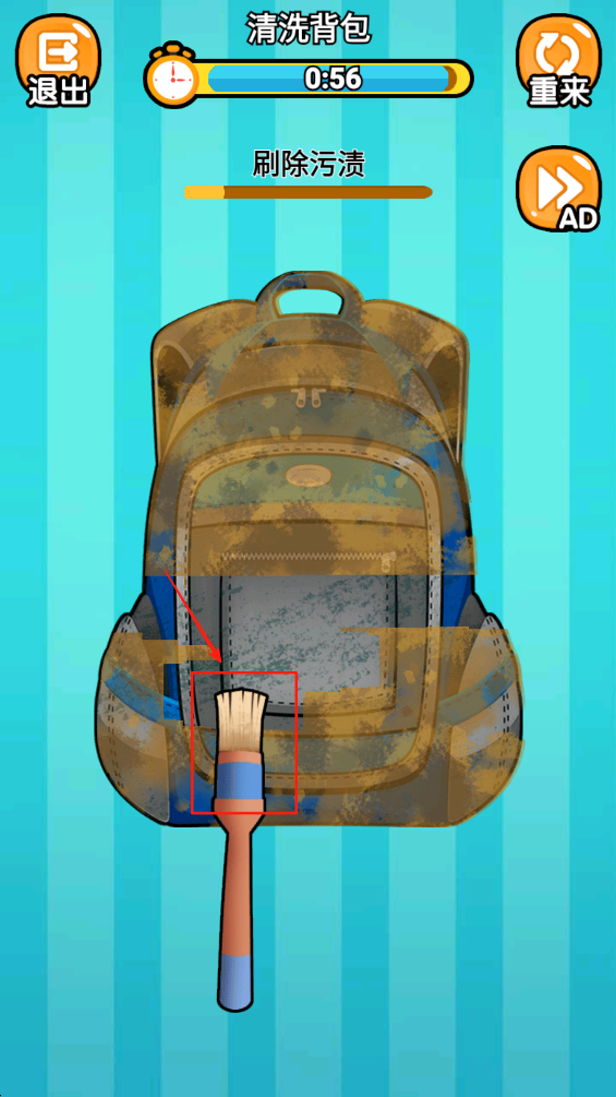 4、在游戏关卡界面,根据提示进行操作,如“清洗背包”,开始你的游戏。