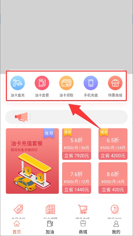 1、首页提供油卡直充、套餐选购、福利领取、话费充值及特惠商城等核心服务。