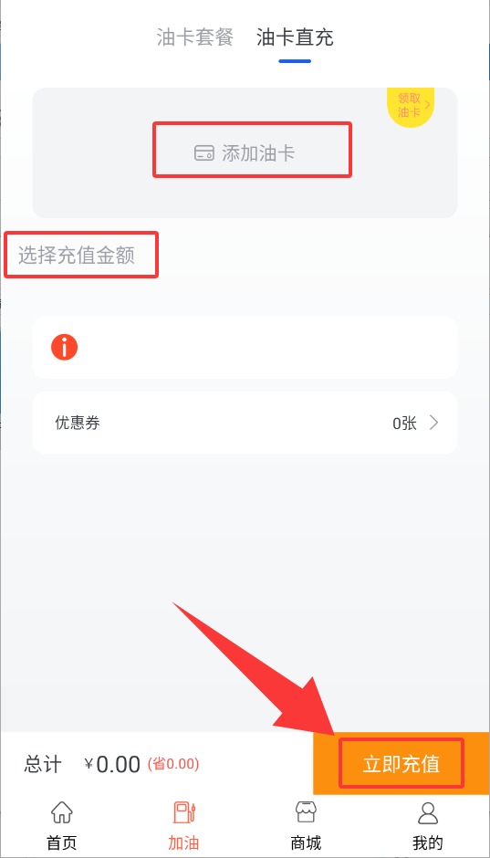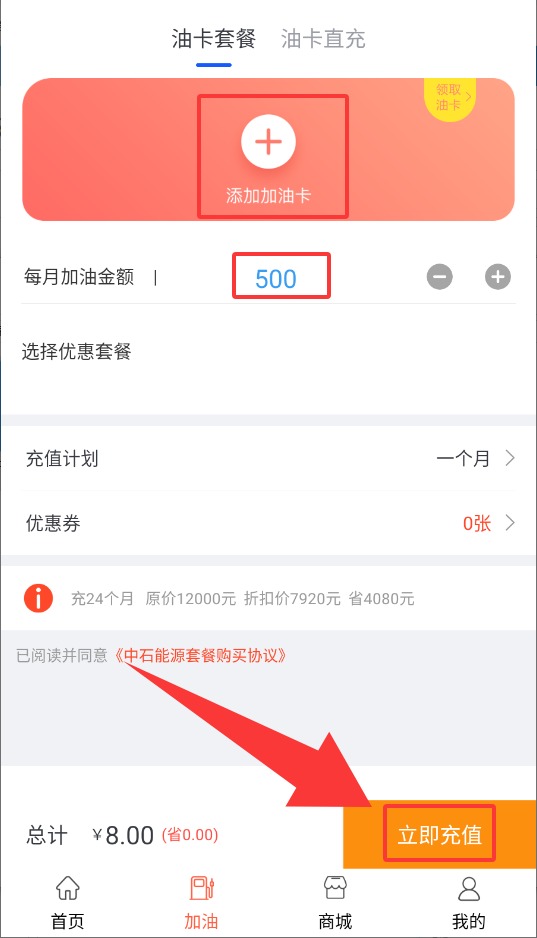 2、通过加油功能可管理油卡套餐,添加卡号并输入金额后即可快速完成充值。