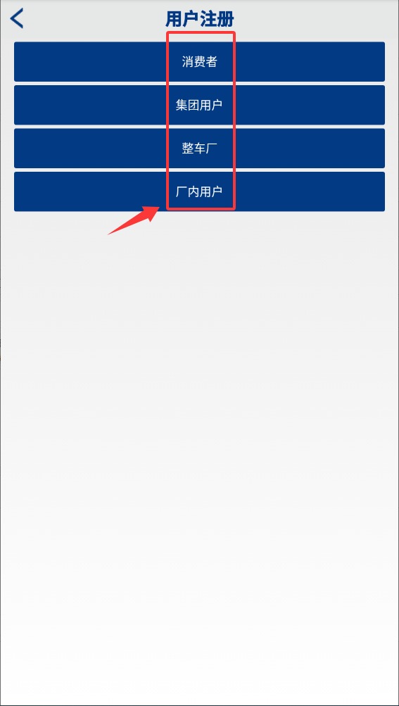 3、根据用户身份(消费者/集团用户/整车厂/厂内用户)选择对应注册类型。