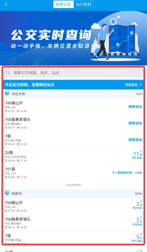 查询实时公交,用户在此可以查询某个公交达到自己站点的时间和距离;