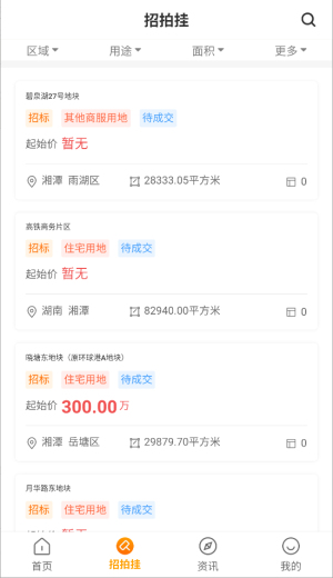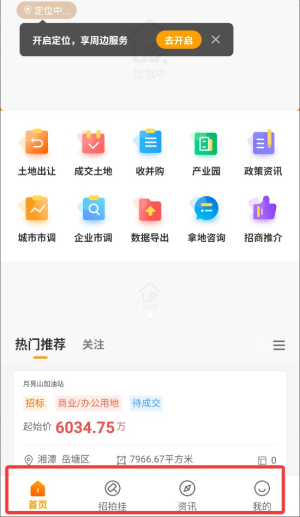 3、通过"土地招拍挂"功能可查看各地土地出让信息及房产交易数据。