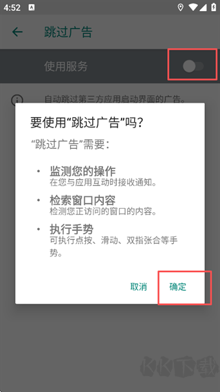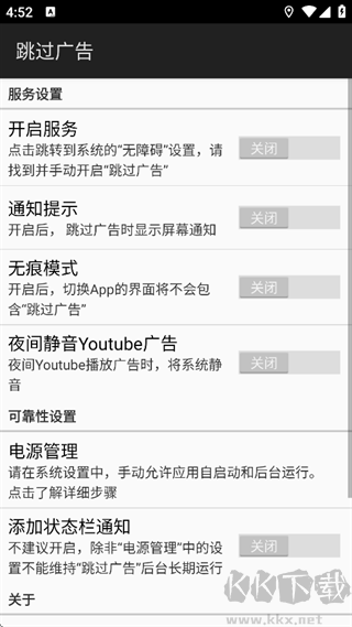 核心功能依托无障碍服务,可智能识别并自动点击屏幕上出现的“跳过广告”按钮,实现全程无需手动操作的自动化跳过体验。