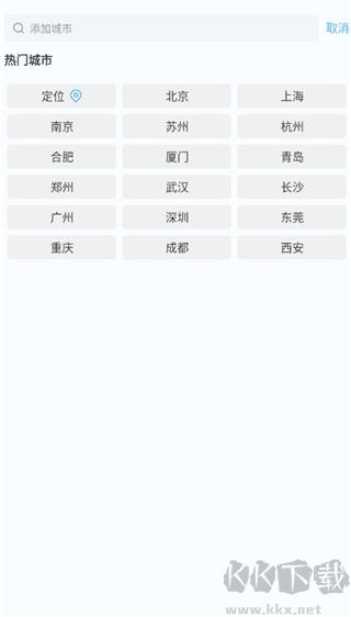 点击首页左上角“+”号,进入城市管理,可从热门城市中选择或搜索目标城市添加,支持快速切换不同地区的天气情况。