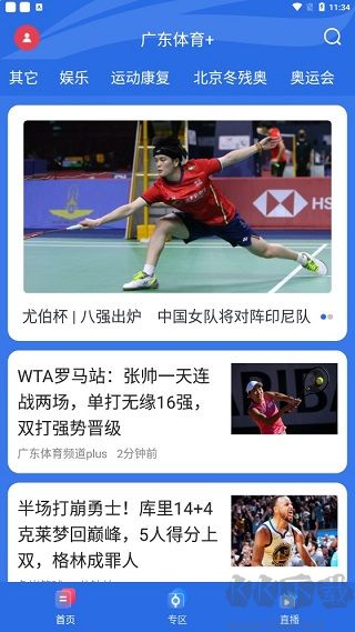 2、除主页消息外,专项区域配置了评论员与运动员主题栏目,可追踪选手最新情况,包含近期要闻和实时转播内容。