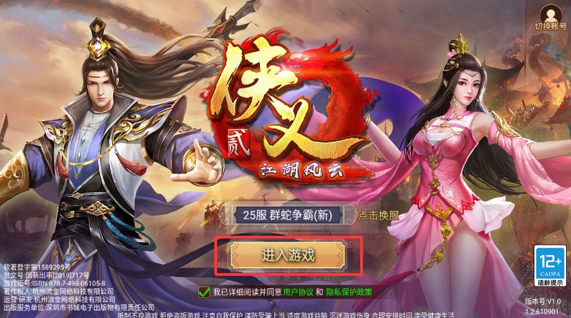 1、启动游戏后选择合适的区服点击进入,即可开启这段武侠世界的冒险旅程。