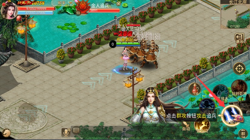 4、点击群攻按钮对追兵发动范围攻击技能,在激烈战斗中体验畅快的武侠对决。