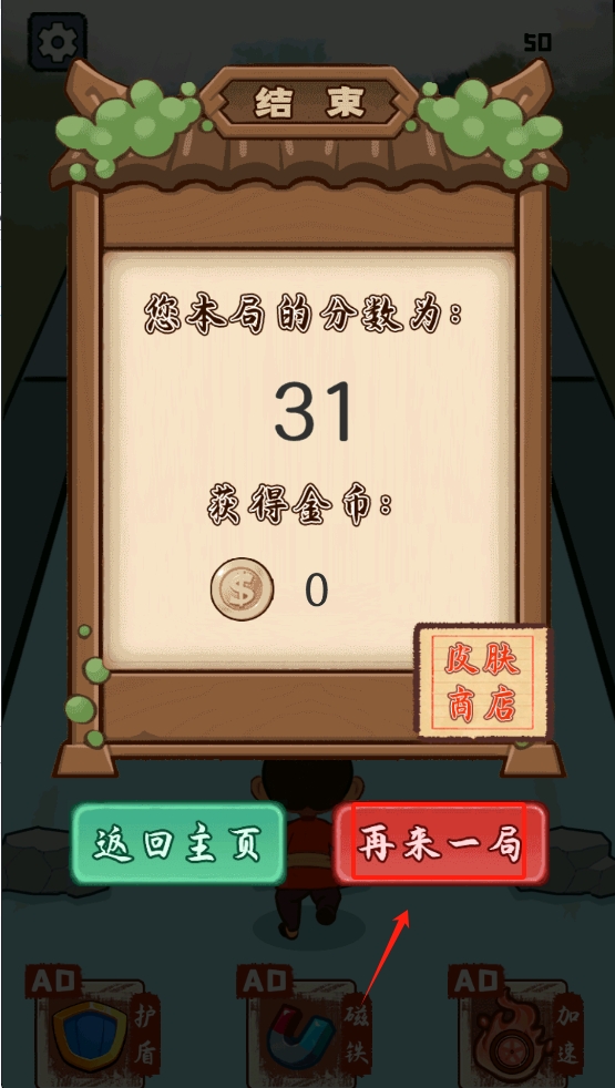 4、游戏结束后,查看你的得分和获得的金币,点击“再来一局”继续游戏。