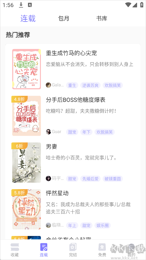1、打开寒武纪年小说App后,在首页可以看到“收藏”“连载”“完结”“免费”“我的”五大板块,功能布局清晰明了。