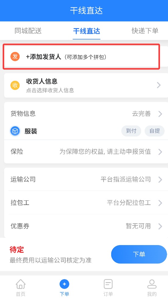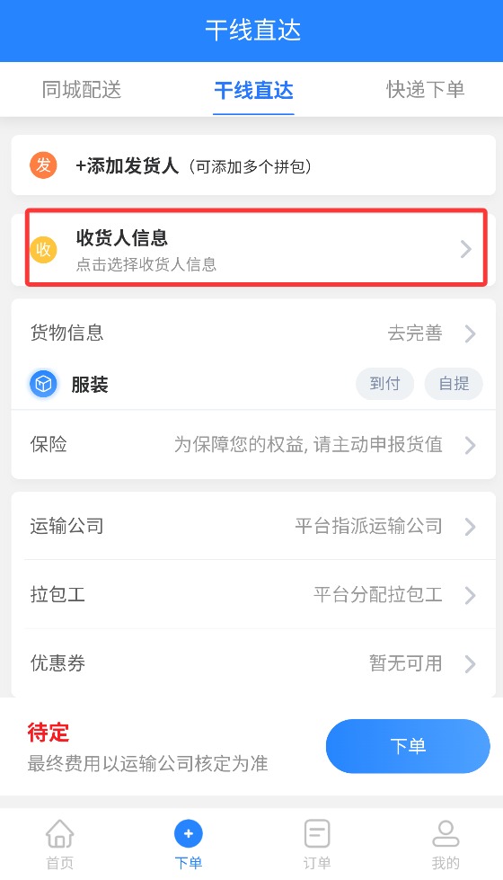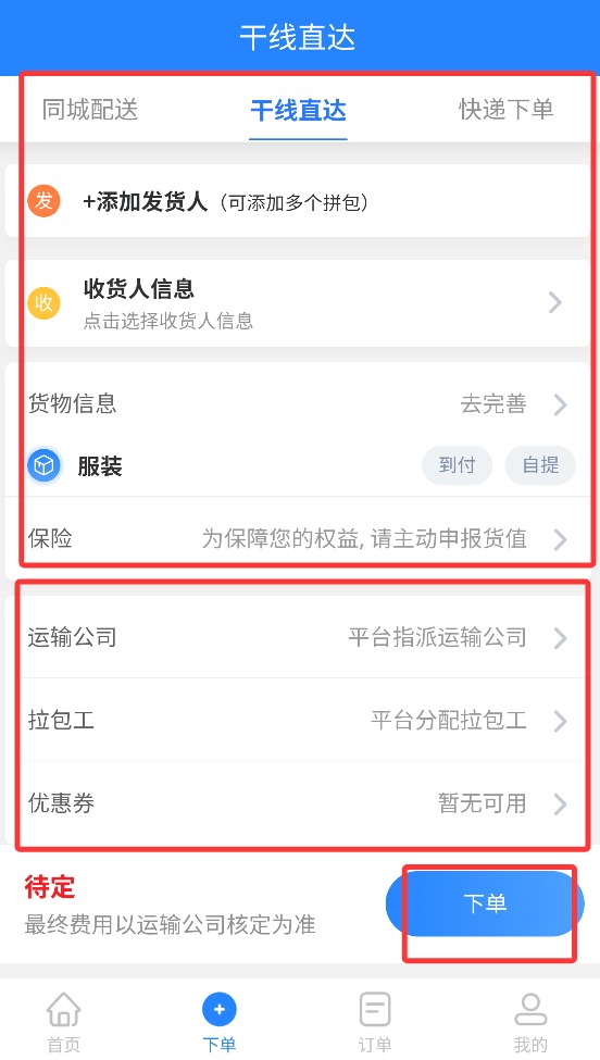 4、确认运输方案后进入下单界面,填写货物详情并选择支付方式即可生成电子运单。