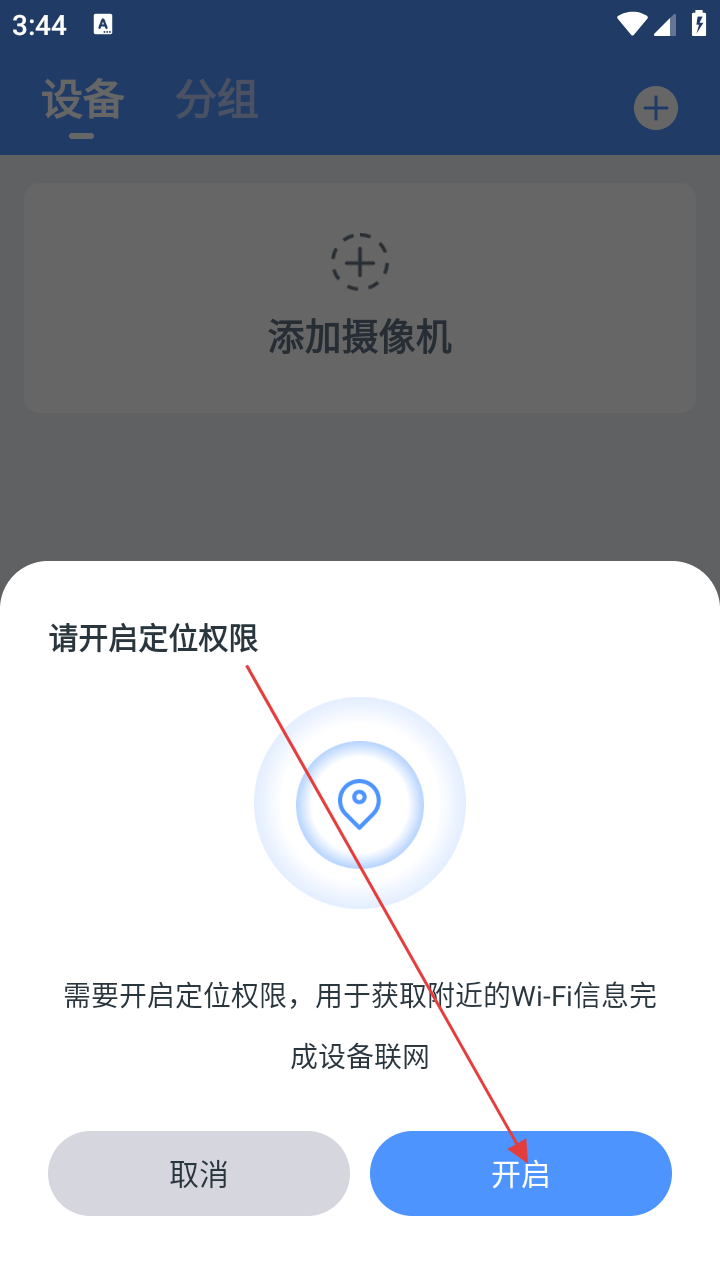 2、弹出权限提示,选【开启】定位,用于获取WiFi信息联网。