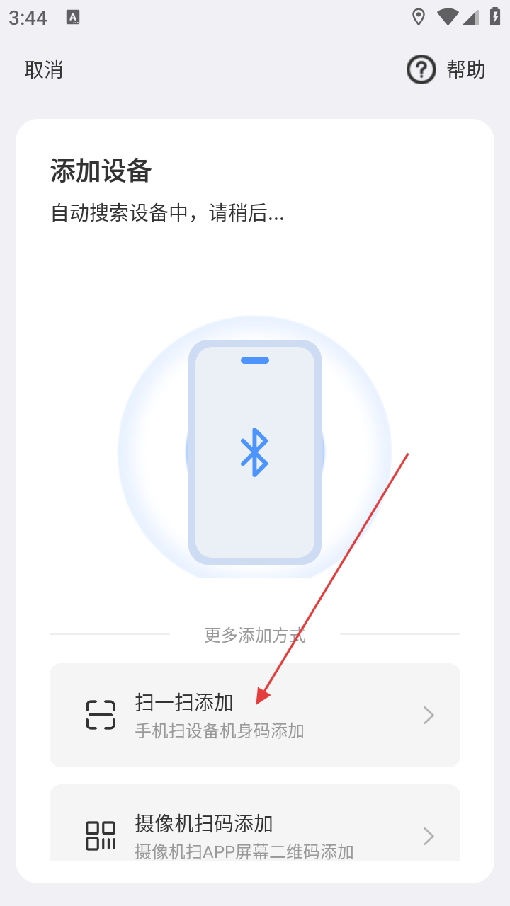 4、进入扫码页,对准设备二维码扫描,按指引完成添加。