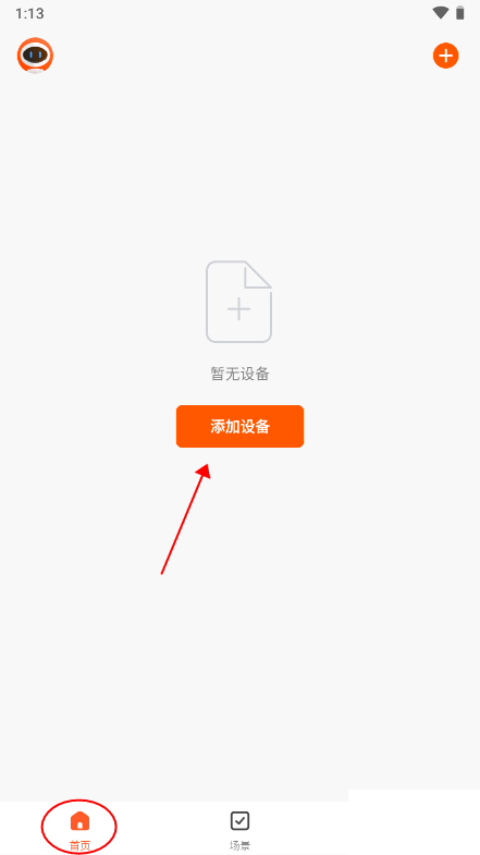 1、打开应用后先注册账号,注册完成之后进入首页,点击添加设备的按钮。