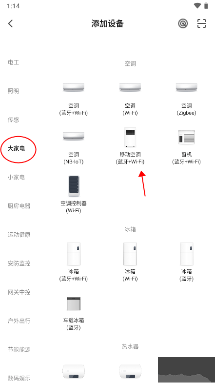 3、根据自己要连接的设备,我在这里选择大家电里面的移动空调,它既支持蓝牙又支持 WiFi。