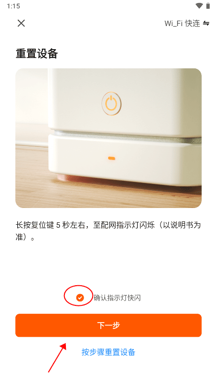 4、先保证家里的电器处于开启状态,勾选确认指示灯快闪,然后点击下一步。