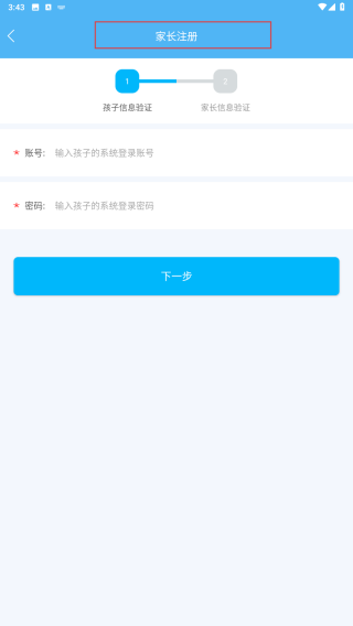 3、在家长注册界面,按要求输入孩子的系统登录账号和密码,点击【下一步】,根据后续提示完成家长信息验证及注册流程。