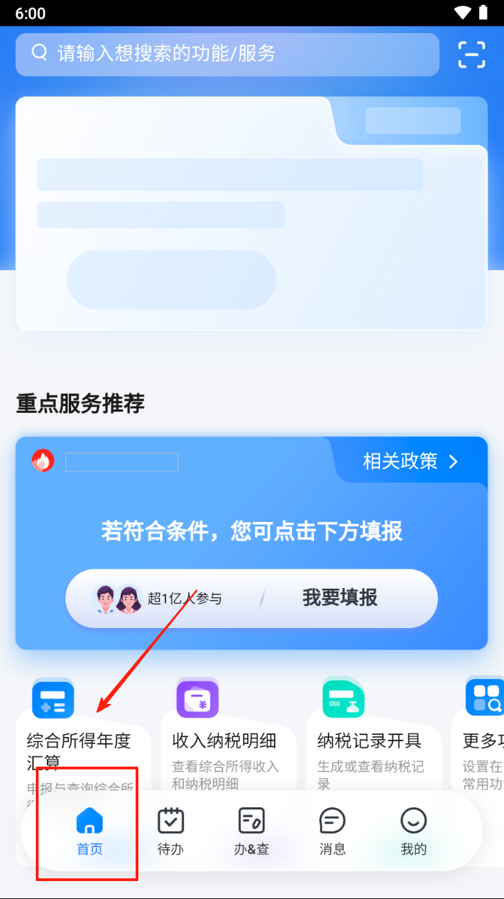 2、进入首页并选择服务。在首页点击“综合所得年度汇算”图标,开始申报流程。